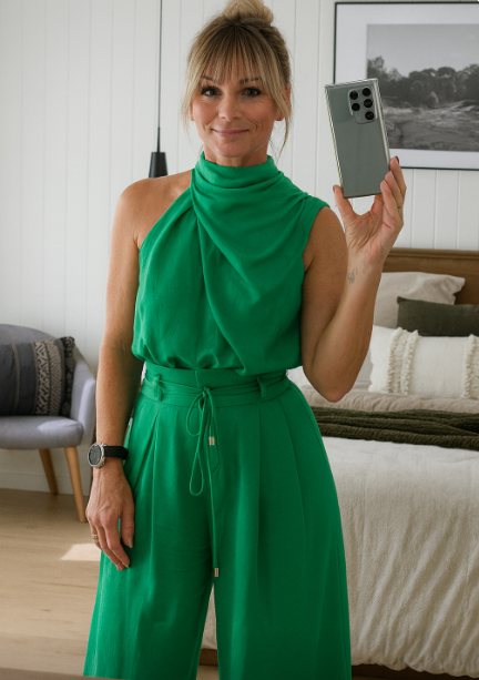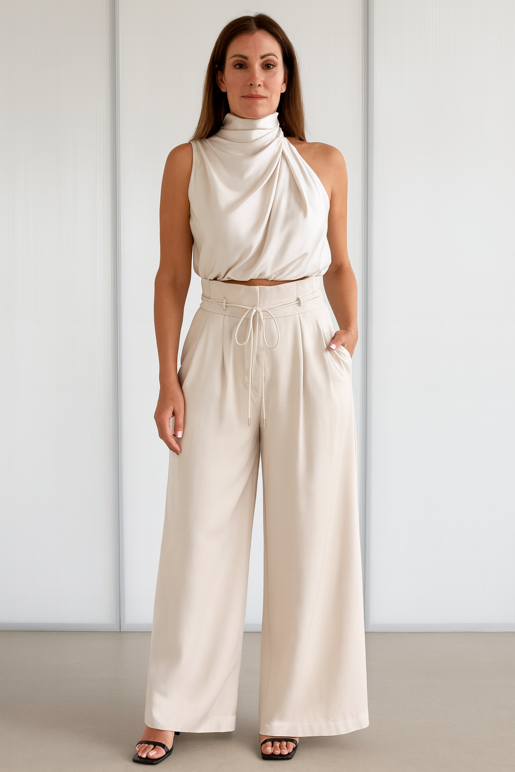 Tento elegantní komplet spojuje moderní šik s maximálním pohodlím. Bezramenný top s drapovaným vodopádovým výstřihem stylově zdůrazňuje siluetu, zatímco kalhoty s vysokým pasem a vázacím páskem formují ženskou postavu. Lehce splývavý materiál zajišťuje lehkost a volnost pohybu. Ideální pro byznys, večeře nebo zvláštní příležitosti.