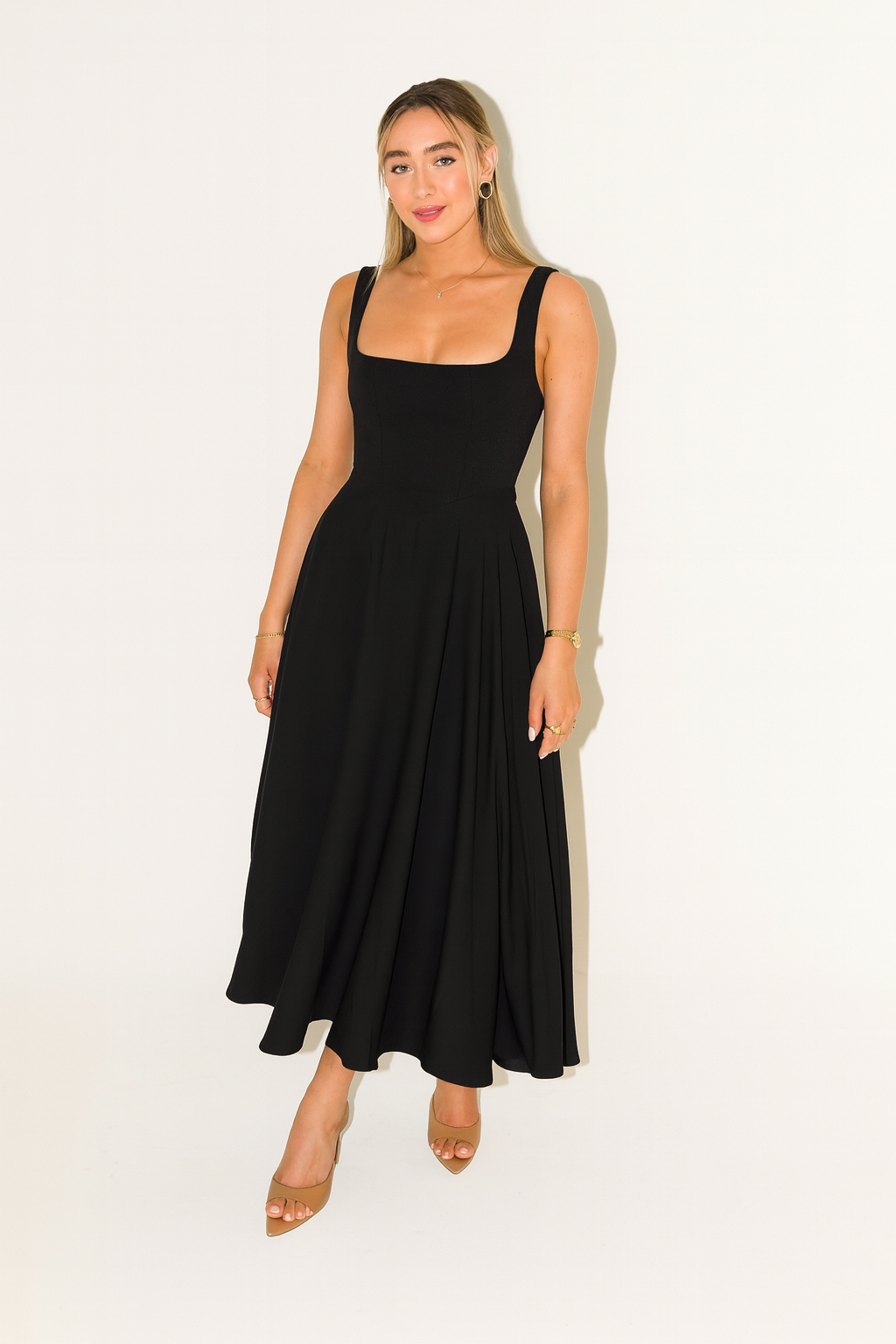 ★★★★★Tyto elegantní černé midi šaty kombinují nadčasový design s moderním komfortem. Přiléhavý vršek s čtvercovým výstřihem vytváří lichotivou siluetu, zatímco široká sukně poskytuje volnost pohybu a ženský vzhled. Vyrobeny z kvalitní, splývavé látky, nabízejí příjemný pocit při nošení – ideální pro zvláštní příležitosti nebo stylové každodenní okamžiky. Široká ramínka zajišťují dodatečnou oporu a elegantní vzhled.